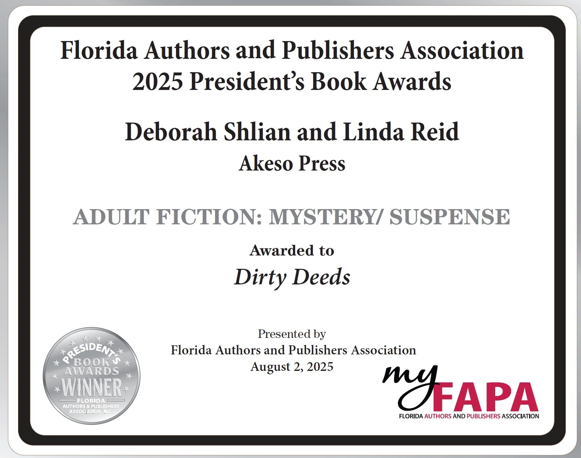Dirty Deeds has been awarded a Silver Medal for Mystery/Suspense in the 2025 President's Book Awards by the Florida Authors and Publishers Association!