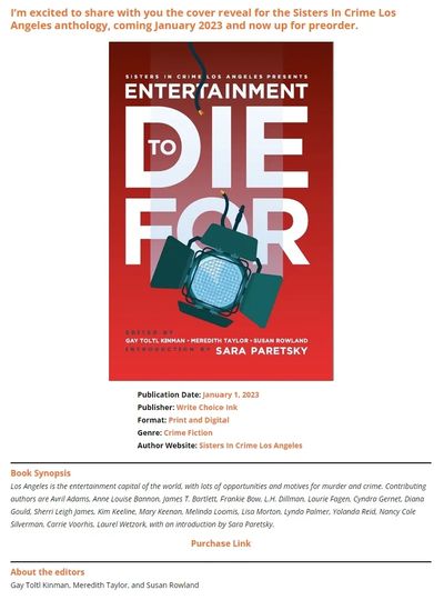 In 2023, my mystery short story was published in an anthology from Sisters in Crime Los Angeles. Enjoy wonderful stories from outstanding mystery authors! You can order the book through Amazon.com